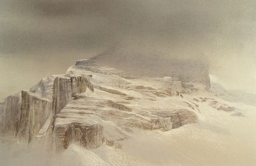 "Tre Cime di Lavaredo", die berühmten Drei Zinnen in den Sextener Dolomiten, sind im Sommer von Touristen überlaufen. Bei schlechtem Wetter und im Herbst aber verlieren sie ihren Ansichtskartencharakter. Die Berggruppe erscheint als geheimnisvolle, unzugängliche Welt jenseits der Realität.