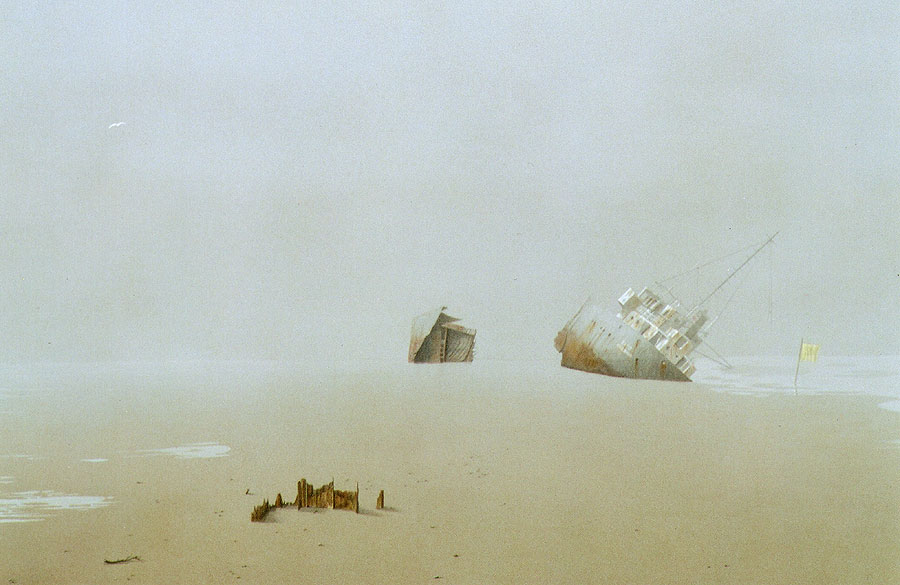 Die Nordsee und ihr weiter, hoher Himmel prägen die Arbeiten dieses Ausstellungsprojektes. Buhnenreste, Wracks oder Strandgut werden zu Metaphern für Vergänglichkeit. Das Watt, dieser trügerische Grenzstreifen zwischen Land und Wasser, Traum und Wirklichkeit, Leben und Tod ist die Bühne für nebelverhangene Visionen.