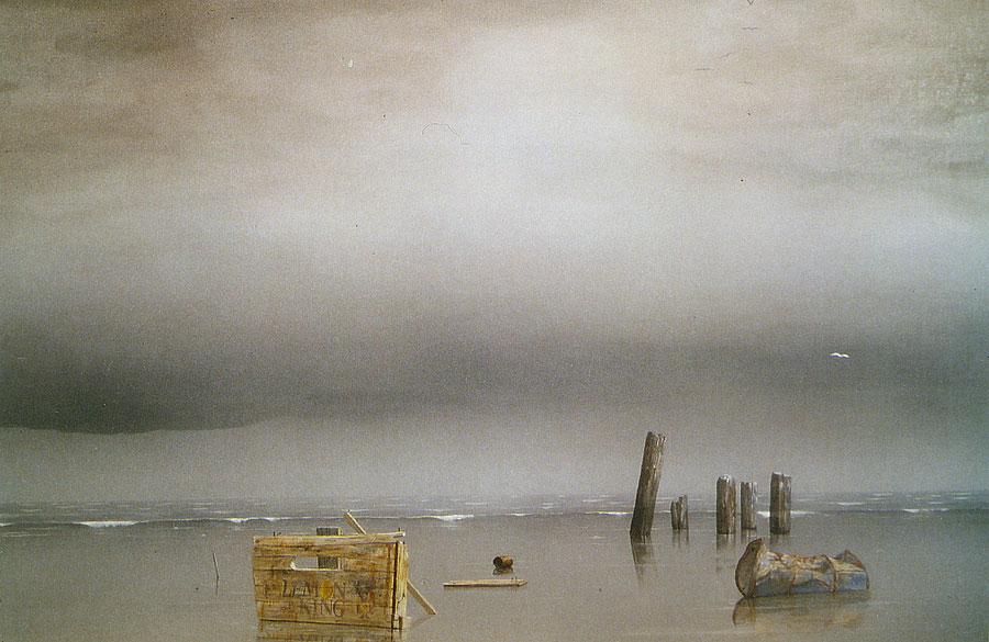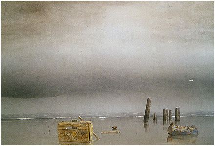 Die Nordsee und ihr weiter, hoher Himmel prägen die Arbeiten dieses Ausstellungsprojektes. Buhnenreste, Wracks oder Strandgut werden zu Metaphern für Vergänglichkeit. Das Watt, dieser trügerische Grenzstreifen zwischen Land und Wasser, Traum und Wirklichkeit, Leben und Tod ist die Bühne für nebelverhangene Visionen.