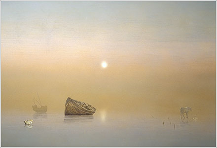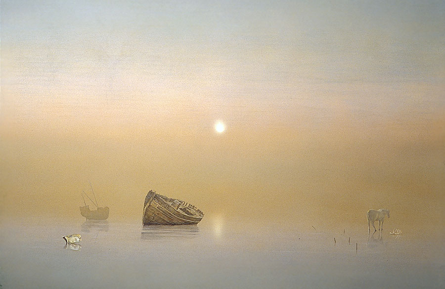 Die Nordsee und ihr weiter, hoher Himmel prägen die Arbeiten dieses Ausstellungsprojektes. Buhnenreste, Wracks oder Strandgut werden zu Metaphern für Vergänglichkeit. Das Watt, dieser trügerische Grenzstreifen zwischen Land und Wasser, Traum und Wirklichkeit, Leben und Tod ist die Bühne für nebelverhangene Visionen.