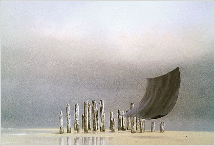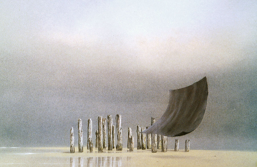 Die Nordsee und ihr weiter, hoher Himmel prägen die Arbeiten dieses Ausstellungsprojektes. Buhnenreste, Wracks oder Strandgut werden zu Metaphern für Vergänglichkeit. Das Watt, dieser trügerische Grenzstreifen zwischen Land und Wasser, Traum und Wirklichkeit, Leben und Tod ist die Bühne für nebelverhangene Visionen.